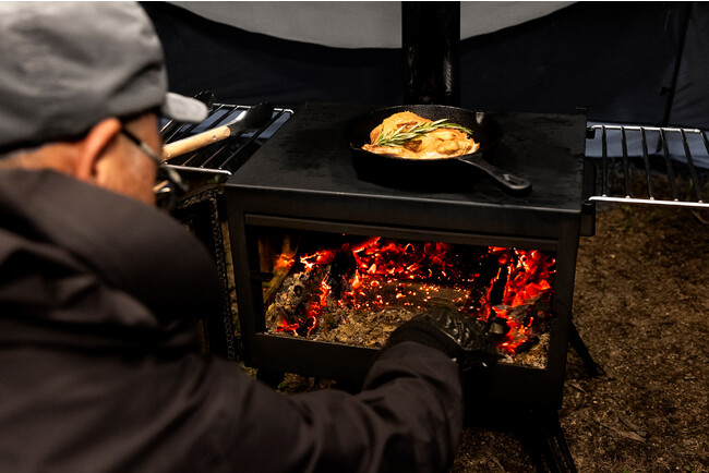 薪ストーブとして天板での調理はもちろん、天板を外すと二次燃焼構造の焚き火台としても使用でき、付属の焼き網を使えばグリル調理も楽しめる3WAYタイプ。