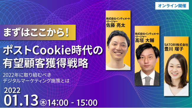 国内最大級パブリックDMPを提供するデータプラットフォームカンパニーの株式会社インティメート・マージャー(本社:東京都港区、代表取締役社長:簗島 亮次、以下当社)は、マーケティングオートメーションツール(以下MA)の開発・販売を手掛ける、SATORI株式会社(所在地:東京都渋谷区、代表取締役:植山浩介、以下SATORI)と、共催Webセミナー「まずはここから!ポストCookie時代の有望顧客獲得戦略~2022年に取り組むべきデジタルマーケティング施策とは~」を1月13日(木)14時より開催することをお知らせします。