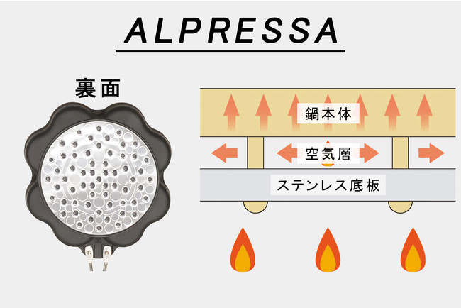 ・特殊構造「ALPRESSA」アルプレッサ方式を採用しているので、本体とステンレス底板の間に空気の層を設けることで、熱が満遍なく均一に伝わり焼きムラなくきれいに仕上がります。