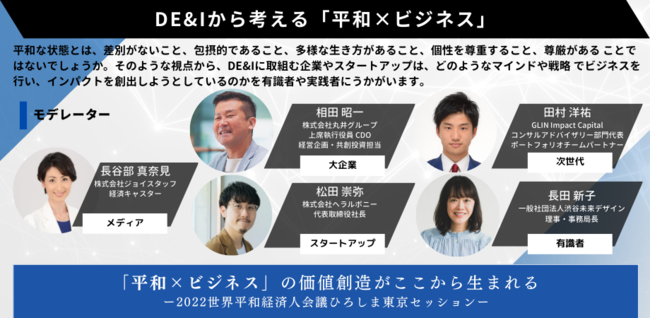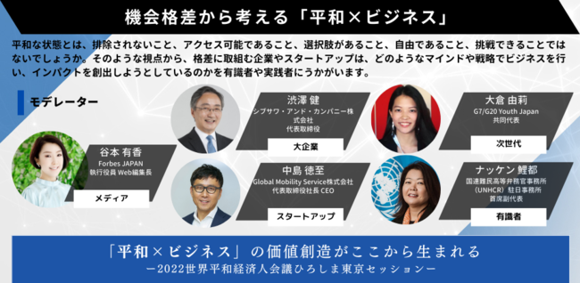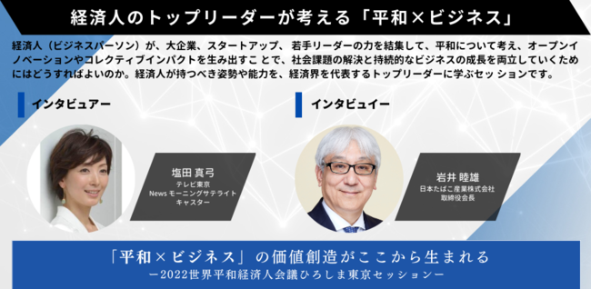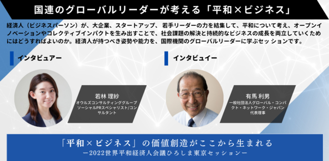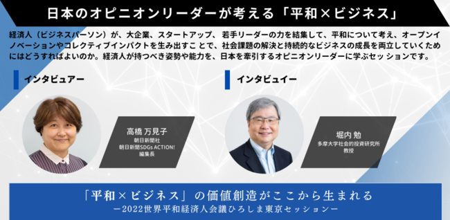 「世界平和経済人会議ひろしま東京セッション」では、社会課題解決と持続可能なビジネスの成長に挑む、有識者や企業、そして起業家をお招きし、これからの経営・ビジネスのあり方を学び、ロールモデルに出会うイベントを開催します。