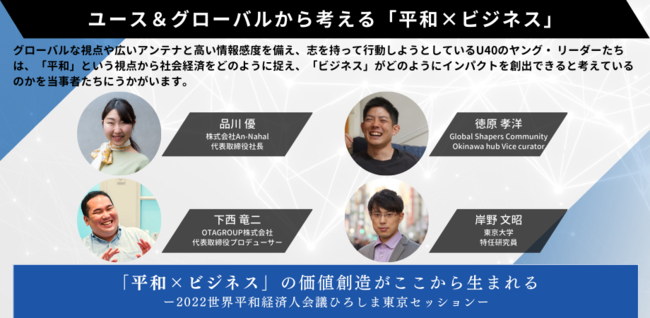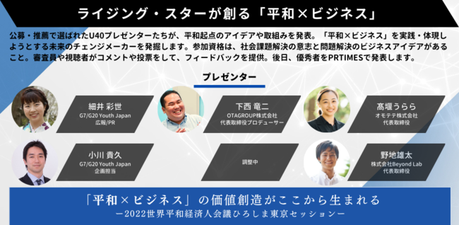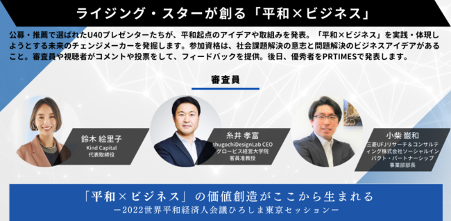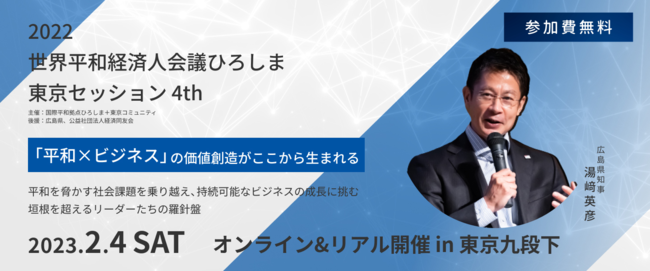 「平和×ビジネス」の調査研究を通じて、平和起点の人材・事例づくりやコミュニティづくりを行う国際平和拠点ひろしま+東京コミュニティ(拠点:東京都中央区、代表:佐々木喬史)は2023年2月4日(土)に第4回となる「2022世界平和経済人会議ひろしま東京セッション|平和×ビジネスの価値創造~平和起点で考える、ビジネスインパクトの可能性~」を開催します。9つのすべてのセッションの登壇者が決定し、今年から新たにリリースする「ピッチ&プレゼンテーションセッション」の第一回出場者と審査員を発表しましたのでお知らせします。平和な未来を担うライジング・スターを発掘する本ビジネスフォーラムでは、今年5月のG7広島サミットを控え、「平和×ビジネス」でメッセージを発信することを通じて、経済人(ビジネスパーソン)が明日からの仕事や生活に活かせる気づきと、志を持って行動する仲間との出会いの場を提供します。