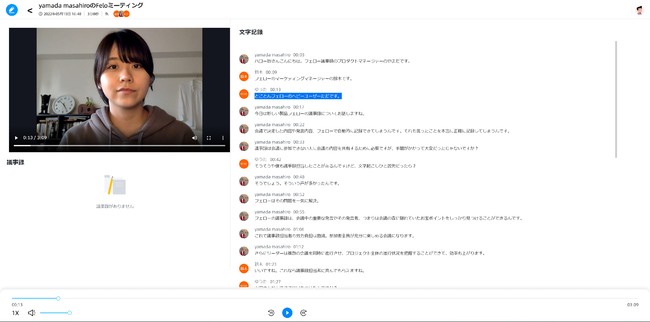 Feloの社員とユーザーの間で実際に行われた会議の様子ですが、ここで録画された映像と自動議事録が体感できます!