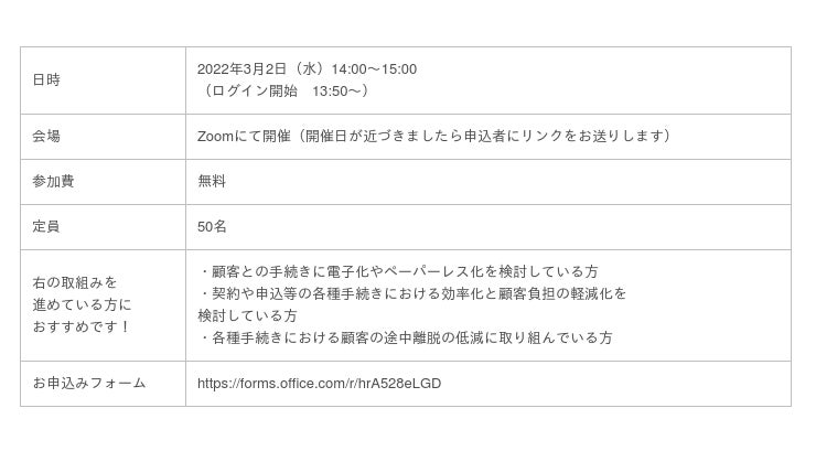 このウェビナーを通じて、申込・契約など様々な手続きをPCやスマートフォンで完結できるソリューションをご紹介いたします。電子署名、電子フォーム、書面への同意、本人確認、ドキュメント収集、PCI準拠の支払いなど、様々な機能が使用できます。