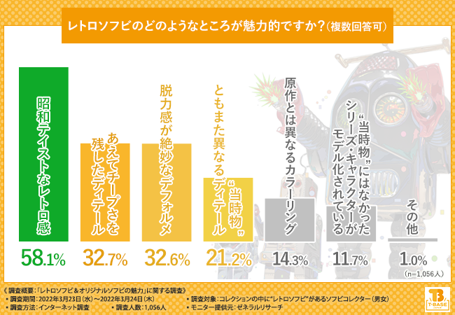「レトロソフビのどのようなところが魅力的ですか?(複数回答可)」と質問したところ、『昭和テイストなレトロ感(58.1%)』という回答が最も多く、次いで『あえてチープさを残したディテール(32.7%)』『脱力感が絶妙なデフォルメ(32.6%)』『“当時物”ともまた異なるディテール(21.2%)』『原作とは異なるカラーリング(14.3%)』『“当時物”にはなかったシリーズ・キャラクターがモデル化されている(11.7%)』と続きました。
