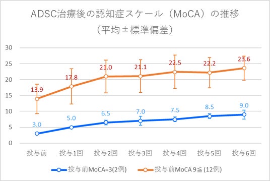 14人のアルツハイマー型認知症患者に対してADSC治療を行い、全ての症例で認知機能評価(MoCA)が改善しました。MoCAは症状の進行の度合いを示す数値で、低いほど認知症が重いことを示します。26以上であれば健常人と同じです。