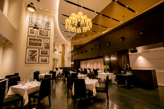 陸上:演劇の舞台は、天井の高いスタイリッシュなレストラン