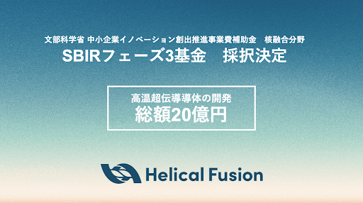 ヘリカル型核融合炉の開発を目指す株式会社 Helical Fusion(本社:東京都中央区、代表取締役:田口昂哉・宮澤順一、以下「Helical Fusion」)は、「文部科学省 中小企業イノベーション創出推進事業(SBIR: Small Business Innovation Research *1, フェーズ3)」の核融合分野(以下本事業)に採択され、1件あたりの最大額である20億円の補助金交付が決定したことを発表いたします。(*2)