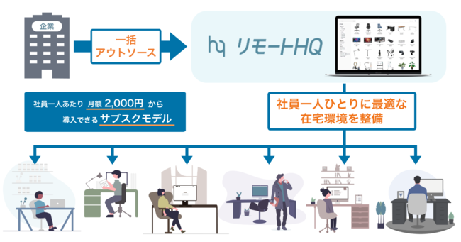 「リモートHQ」は、リモートワークを導入する企業が、社員一人ひとりにとって最適なリモートワーク環境の整備をアウトソースできる、これまでにないリモートワーク環境整備プラットフォームです。