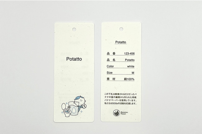SDGs17項目を全て達成できる「バナナペーパー」を使い、環境にやさしい下げ札を制作。紐の部分も環境配慮素材を使用。オーガニック素材を扱うアパレル業界様等におすすめです。