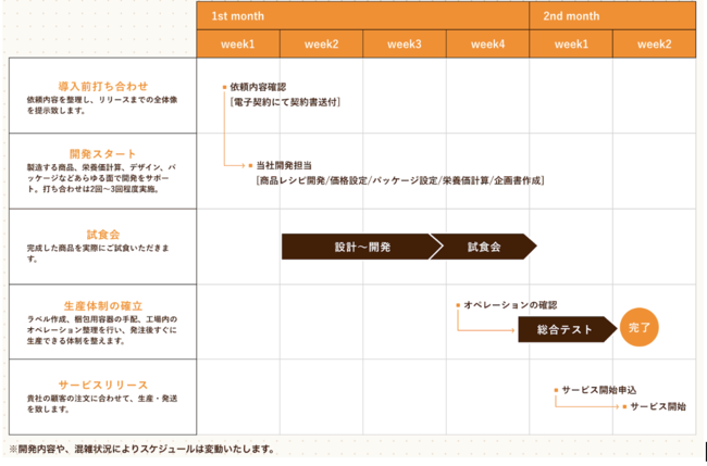 最低ロット数は20食から、予算は30万からで納期は最短1ヶ月からを予定しています。
