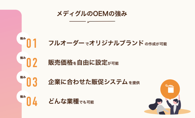 メディグルは自社の強みとして「フルオーダーでオリジナルブランドの作成が可能」、「販売価格を自由に設定が可能」、「企業に合わせた販促システムを提供」、「どんな業種でも可能」の4つを掲げています。