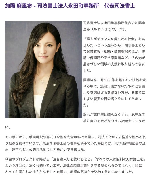 Legal AI 株式会社(本社:東京都)は、すべての人に完全無料で司法サービスを提供するプロジェクトにおいて、司法書士法人永田町事務所代表の加陽麻里布氏が参画したことを発表いたします。これにより、AIによる「訴状・書面作成機能」の実用性を高め、クラウドファンディング「Campfire」を通じた支援募集を加速させます。