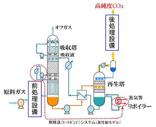 化学吸収法は、吸収液にCO2を選択的に反応吸収後、加熱してCO2を分離回収する方法です。CO2分離に必要な熱エネルギーが分離回収コストの大部分を占めるため、この熱エネルギーを低減することが開発のポイントとなりました。この課題を解決するために、新しい化学吸収液の開発、実用化技術の開発を行いました。