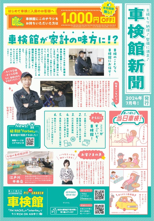夏は気温の上昇により車の部品が故障しやすく、車に関する相談が増える時期です。この機会に車検館での車検をご体験いただくため、初めて入庫いただくお客様で車検館にチラシをお持ち込みいただいた方、または掲載ホームページの画面をお見せいただいた方限定で1,000円の割引キャンペーンを実施します。今回のキャンペーンでは、当社の強みである熟練の整備士たちの仕事に向き合う姿を知っていただくため、その技術力とサービスの質を伝えられるような折込チラシを配布します。