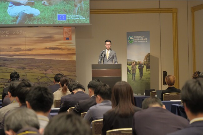 そして調査会社GIRAマーケット・アナリスト、西出香氏をゲストスピーカーとしてお招きし、『日本のビーフ・ラム肉市場の見通し~豊富な輸入品を嗜む食卓』と題して展望を発表しました。近年日本では魚の消費量が減少し、肉の消費量が増加する傾向にあり、このトレンドは当分の間続くと予測されていると説明しました。「アイルランドは国土の6割が牧草地の緑豊かな国で、目覚ましい経済発展を遂げた今でも、その美しい景観と親しみやすい人柄は変わりません。アイルランド産肉牛の95%以上が牧草肥育(グラスフェッド)で飼育されており、生産者の愛情のこもった、滋味豊かな牛肉や羊肉製品を知って頂ければ幸いです。」とコメントし締めくくりました。