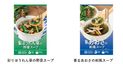 「その場deスープ」 ほうれん草の野菜スープ、あおさの和風スープ