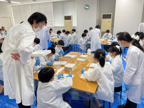 この度の「ユシロ化学ラボ」は,寒川地域の小学3年生~6年生を対象にした参加費無料の化学実験教室で、40名に参加していただきました。今回は、”目で見て分かる!!”をテーマに「ビタミンCの酸化還元反応」・「ルミノール反応」・「人工イクラの作製」の実験を行いました。