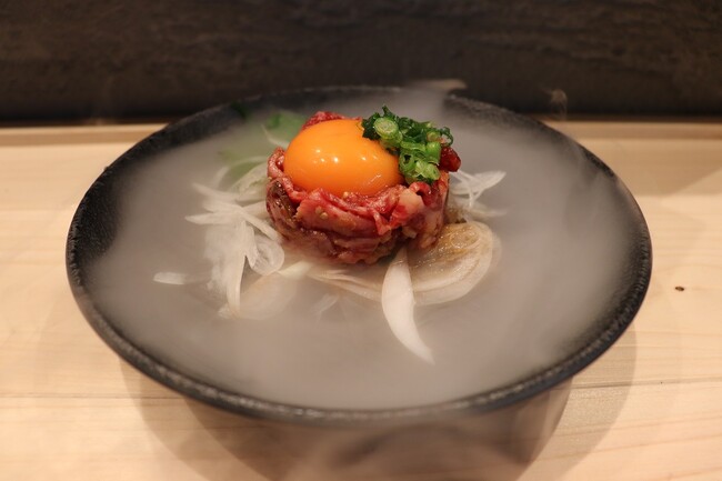 同じく看板メニューの「和牛ユッケ<雲海>」はドライアイスの演出で、ビジュアルにもこだわった一品。