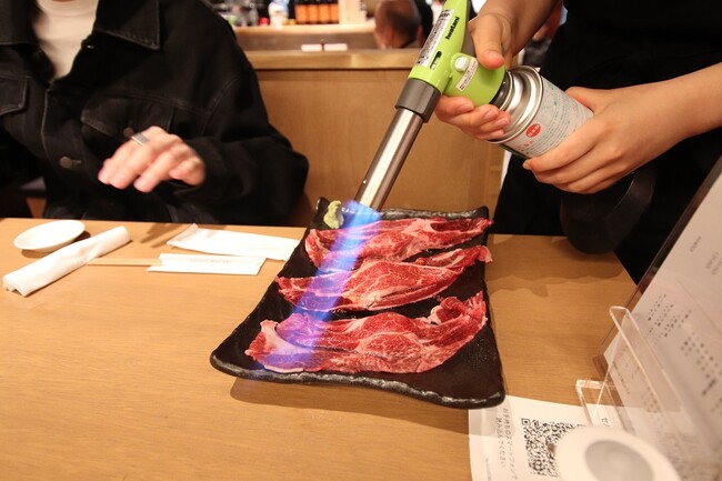 「和牛あぶり」も大人気メニュー!こちらはご注文を頂いてから、目の前で炙ってお出しします。