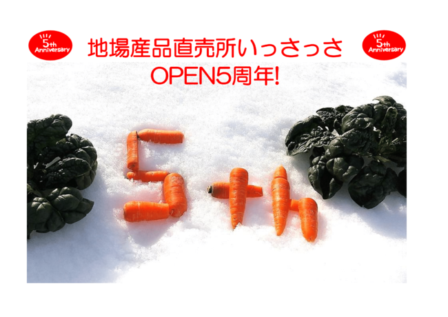 多くの方のご要望により期間限定プレハブ小屋から通年営業の直売所になり早くも5年が経ちます。豪雪地帯ということもあり冬場は農産物も少ないのですが無事に5周年を迎えられましたことを感謝し、記念イベントを開催いたします。