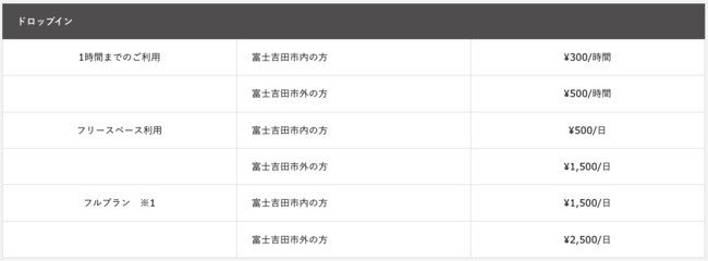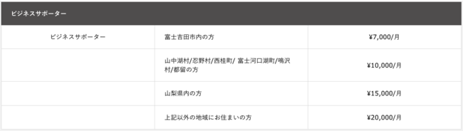 内容:月額契約を結ぶことでフリースペースを月内無制限で使用することができ、さらに有料オプションメニューを追加することで富士吉田市にビジネスの拠点を設けることができるメニュー