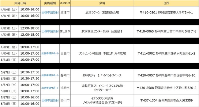 ※開催場所の調整状況や新型コロナウィルスの感染状況等により、「出張申請受付」及び「出張申請サポート」の開催を中止・延期、または実施内容が変更となる可能性がございます。