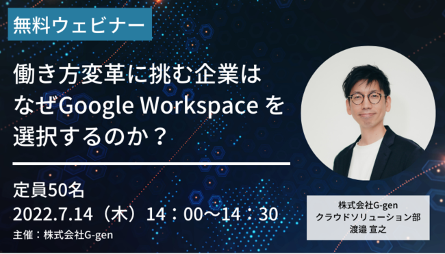 株式会社G-gen(本社:東京都新宿区、代表取締役:羽柴孝)は、無料ウェビナー「働き方変革に挑む企業はなぜGoogle Workspace を選択するのか?」を実施いたします。