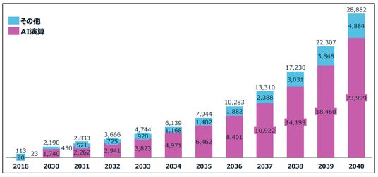 AIの社会実装ペースに基づく、データセンタのサーバー消費電力予測(単位TWh/年) ※JST低炭素社会戦略センター「情報化社会の進展がエネルギー消費に与える影響」の予測値をベースに試算