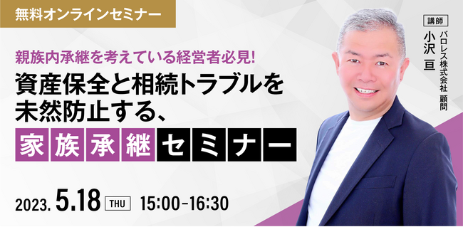 一般社団法人企業共創支援機構(所在地:東京都中央区 代表理事:小沼勢矢)は、2023年5月18日に「親族内承継を考えている経営者必見!資産保全と相続トラブルを未然防止する、家族承継セミナー」をオンライン開催いたします。講師に、保険業界において金融知識を磨き、事業再生やM&Aの支援、ファミリーオフィス紹介、さらには自らも息子に事業を継承するバロレス株式会社の顧問である小沢亘氏を迎え、子や孫など、親族内承継を考えている経営者の方々に、失敗のない事業承継のための貴重な知識とノウハウを提供する貴重な機会です。オンライン開催、参加費無料にてご参加いただけます。