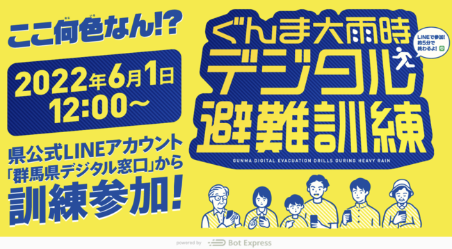 群馬県民の防災意識向上を目的に、LINE公式アカウント「群馬県デジタル窓口」を活用しスマートフォン上で避難訓練を実施。コロナ禍で人を集めての避難訓練が困難となり、防災意識の低下が懸念されることから、自宅や地域にどのような災害のリスクがあるか、避難所の位置などを知ってもらい、いざというときの避難に役立ててもらうことを狙いとしています。