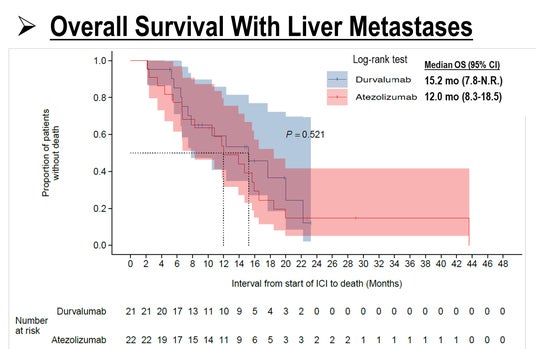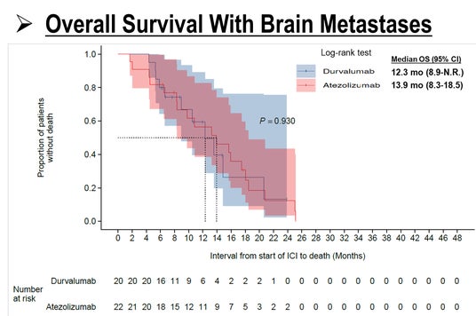 脳転移を有する患者におけるATZ-G (n = 22) 対DUR-G (n = 20)のOS中央値は、それぞれ13.9か月(95%信頼区間[CI]: 8.3-18.5)対12.3か月(95%CI: 8.9- not reached [NR])で有意差は認められませんでした(P= 0.930)。骨転移を有する患者におけるATZ-G (n = 21) 対DUR-G (n = 20)のOS中央値は、それぞれ11.7か月(95%信頼区間[CI]: 10.6-NR)対7.7か月(95%CI: 6.0-15.2)で有意差は認められませんでした(P= 0.117)肝転移を有する患者におけるATZ-G (n = 19) 対DUR-G (n = 21)のOS中央値は、それぞれ12.0か月(95%信頼区間[CI]: 8.3-18.5)対15.2か月(95%CI: 7.8-NR))で有意差は認められませんでした(P= 0.521)。