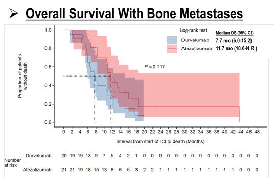 - 脳、骨および肝転移において、アテゾリズマブとデュルバルマブに同等の有効性があり、骨転移は全生存期間(OS)不良の重要な予後因子となる可能性があるとの結果