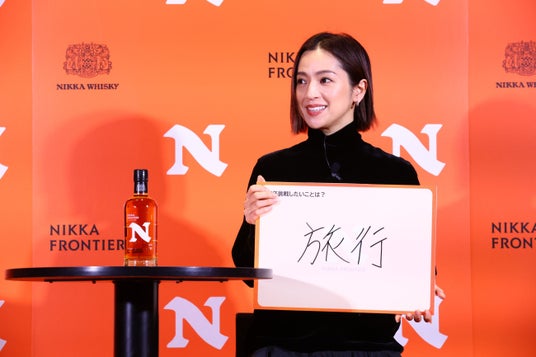 また、『ニッカ フロンティア』のブランドコンセプト“あなたの地図に、まだない場所へ。”にちなんで、来年挑戦したいことを聞かれると「旅行」とフリップで回答。「蒸溜所など自分の好きなものが生まれる場所などに行って、知識を深めて自分を高めていきたい」と中村さんのストイックな一面が垣間見えました。さらに、プライベートでもハイボールを楽しむことがあるという中村さん。お酒を飲むシーンを聞かれると、「お仕事が終わったあとの一口はやっぱり最高ですね」と笑顔を見せました。