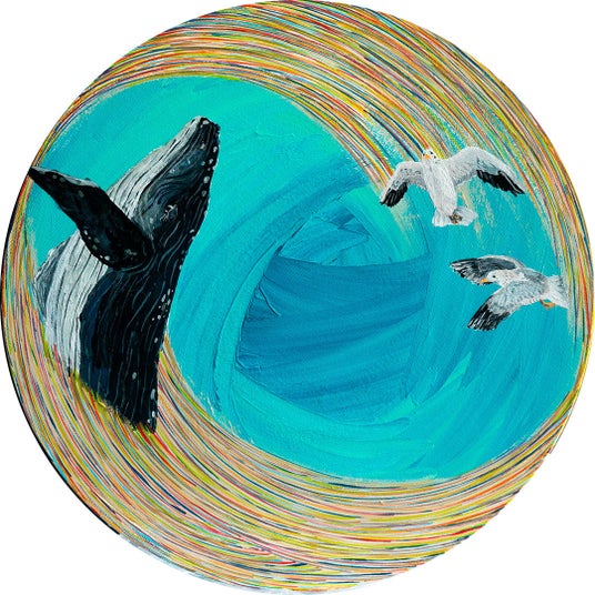 田んぼの風景は、私の地元の原風景でもあります。春夏秋と表情を変える稲穂は、いつも風に吹かれて穂先を踊らせていました。そんな心地よい「風」を描きたいと思い、幸運の象徴・鯨と、自由や希望の象徴・カモメを風の中に描きました。