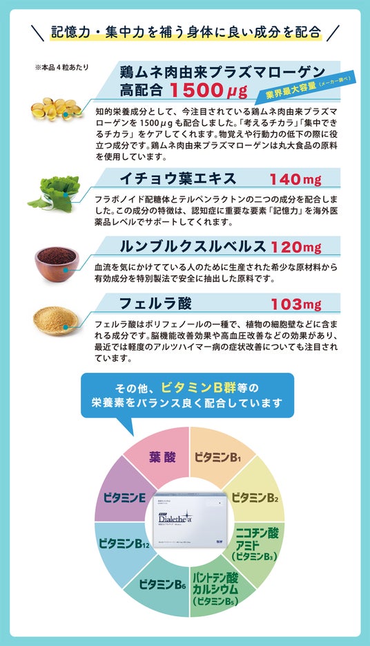 「機能性 ジアレティア(R)」の主力成分でもある丸大食品の「鶏由来プラズマローゲン」は学習機能向上の特許を取得しており、老若男女問わず愛用できる成分として、長年多くの方に利用して頂いている成分です。