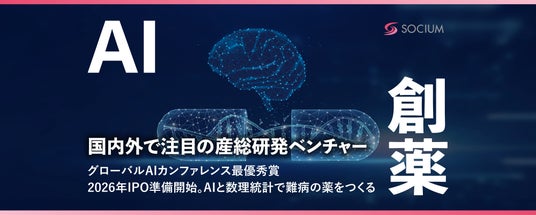 ソシウム株式会社は、ファーストインクラスの低分子化合物の創薬を行う創薬ベンチャー企業です。「薬のない人に薬を、薬の効かない人に薬を」をビジョンに掲げ、疾病に苦しむ患者様のアンメット・メディカル・ニーズの克服に取り組んでいます。独自のAI創薬プラットフォームCompound-Eyes(TM)、Drug Saver(TM)、Cyber-Drug-Discovery(TM)を用いて、従来の薬理学的なターゲットに限定されることなく、遺伝子発現など分子情報に基づいた新奇な創薬標的の探索や作用メカニズムの解明を行っています。現在、がんや難病・希少疾患などの開発ポートフォリオを有しております。詳しくは、ソシウムのホームページ(https://socium.co.jp/ja/) をご覧ください。