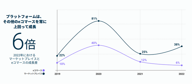 本調査結果から、2022年におけるマーケットプレイスの成長率はEC全体の6倍となり、さらにその差は拡大していることがわかります。これは、マーケットプレイスプラットフォームを活用して、在庫と物流に掛かるコストを削減しつつ、より幅広い品揃えと利益率の改善に対応したためです。 本件を通じ、経営者層、新規事業開発者、DX推進者、新規事業開発者、EC責任者様が事業成長戦略の一環としたEC活性化、収益向上を検討する際 の一助になることを目指しています。