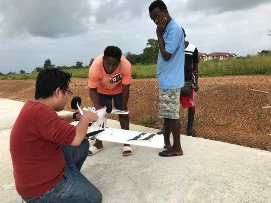 現地の方々に固定翼型ドローンの説明を行う(シエラレオネ)
