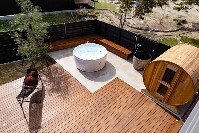 サウナや水風呂、ジャグジーがあり、1グループだけが貸切で利用できることもあり、プライベート空間でサウナと貸別荘を楽しめる施設である。