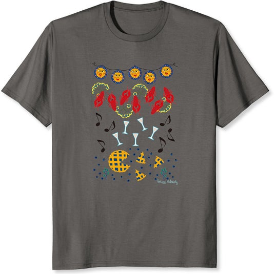 8月がザリガニの解禁シーズンだった昔の名残で、夏の終わりにあちこちで催されるアウトドアのイベント、ザリガニパーティーをデザイン。太陽柄の提灯を飾り、ザリガニ模様の三角帽とエプロンを身につけ、ディルで香りづけされ赤く茹で上がったザリガニをみんなで囲みます。スナップスというお酒を飲みながら酔っ払いの歌を歌い、夜更けまで楽しみます。(C)Solvejg Makaretz