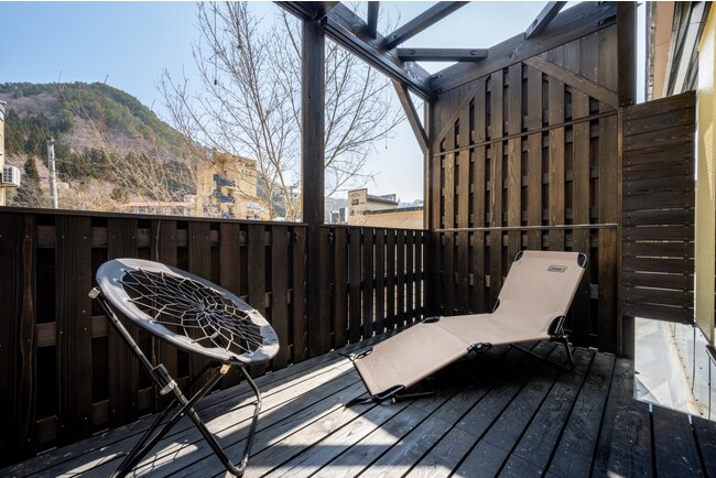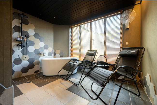 また、外気浴スペースがあり、椅子やベッドでゆったり寛げる。