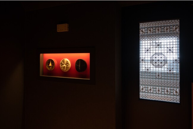 ドアには、米沢で木の灯りを手がける林工芸の林久雄さんが伝統工芸・組子の技法で作ったマンダラを飾った。オートロウリュ時には室内が暗くなり、組子のマンダラが浮かび上がる。