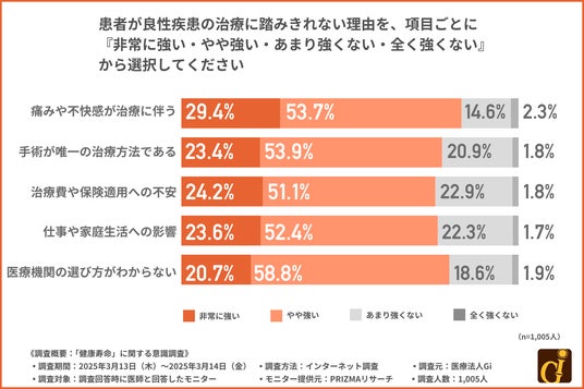 「患者が良性疾患の治療に踏みきれない理由を、項目ごとに『非常に強い・やや強い・あまり強くない・全く強くない』から選択してください」と質問したところ、下記のような回答結果になりました。