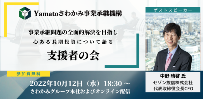株式会社Yamatoさわかみ事業承継機構(本社:東京都千代田区、代表取締役:吉川 明)は、中小企業の事業承継問題の全面的解決を目指し、個人投資家の方が「社会貢献しながら資産運用する」ソーシャル運用(R) の機会を提供すべく「事業承継未来ファンド 2022-3(第5号)」の募集を開始し、本年12月12日まで申し込みを受け付けます。本ファンドの詳細については下記より資料請求をお願いします。