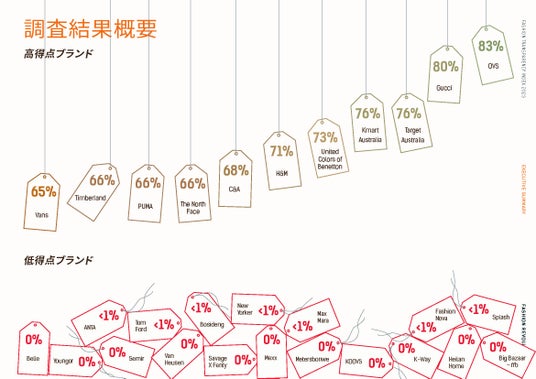 7年連続で本指標を発表してきたが、2023年、初めて2つのブランドが80%以上の得点を獲得した。イタリアのブランドOVSが83%で今年も最高得点を獲得し、次いでグッチが80%、そしてKマート・オーストラリアとターゲット・オーストラリアが76%で続いた。OVSは昨年より5ポイント上昇、グッチは21ポイント上昇、Kマートとターゲット・オーストラリアは2ポイント低下した。最もスコアの低いブランド