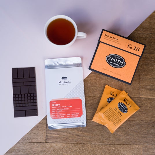 ブルーベリーのような果実味が特徴の「FRUITY」は低温焙煎の浅煎りで仕上げることで、カカオ豆がもつ果実味と華やかな甘い香りを引き出した1枚。そこで一緒にペアリングをお楽しみいただくティーは、ハチミツやネクタリンを始めとするストーンフルーツの香りが豊かなルイボス主体の「No.13 Red Nectar」。口に含んだ瞬間、チョコレートの爽やかな味わいと、ティーの大地のような香りが強調され、それぞれの新たな表情を楽しむことができます。また後半には、ティーがチョコレートの甘みを優しく包みこみ、次の一口を楽しむためのお口直しとしての役割も果たしてくれます。