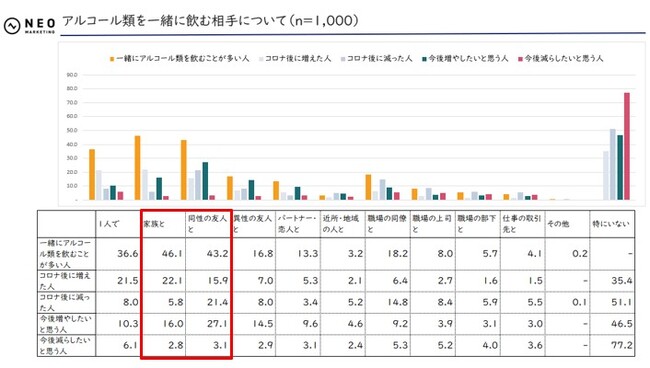 現在一緒に飲む相手としては「家族と」が46.1%でトップとなり、「同性の友人」(43.2%)、「1人で」(36.6%)と続きました。減った人では「同性の友人と」(21.4%)、「職場の同僚と」(14.8%)といった答えが目立ちました。
