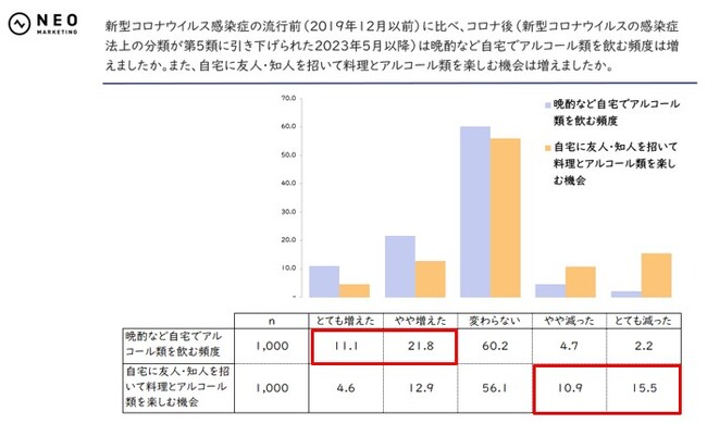 ・コロナ禍を経て「自宅でアルコール類を飲む頻度」は増加。一方で「友人・知人を招いて料理とアルコール類を楽しむ機会」は減少傾向に