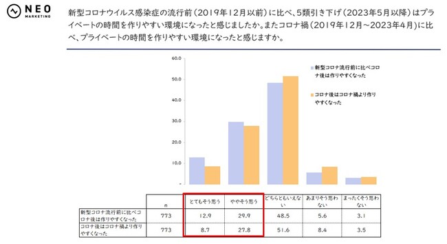 新型コロナウイルス感染症の流行前と比べ、プライベートの時間を作りやすくなったと答えた人は「とてもそう思う」「ややそう思う」を合わせて42.8%にのぼりました。また、コロナ禍に比べてプライベートの時間を作りやすくなったと答えた人は「とてもそう思う」「ややそう思う」を合わせて36.5%と3人に1人以上がプライベートの時間を作りやすくなったと回答しています。