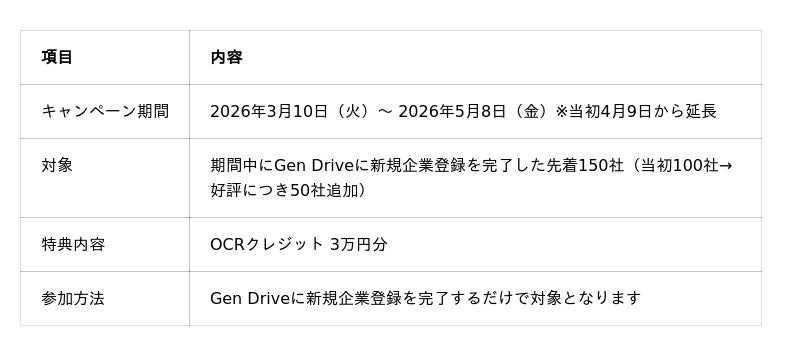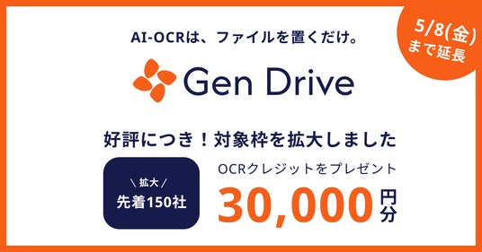 Gen Driveのリニューアルを記念して実施中のOCRクレジット3万円分プレゼントキャンペーンは、当初の先着100社に開始からわずか4営業日で到達いたしました。多くのお申し込みをいただいたことに感謝し、対象枠を先着150社に拡大するとともに、キャンペーン期間も2026年5月8日(金)まで延長いたします。